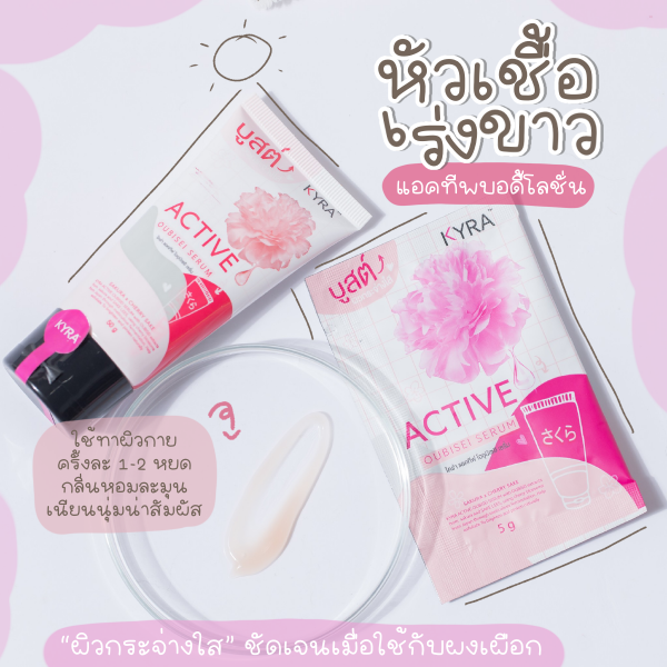 Kyra Active Oubisei Serum combines the power of double petal cherry blossom extract and excellent fermented sake from Japan. It stimulates collagen production. adds moisture to the skin. It also helps naturally exfoliate skin cells. Contains moisturizing agents such as glyceryl glucoside, which is found in the immortal tree. Helps nourish tired skin. becomes as soft and smooth as baby skin.